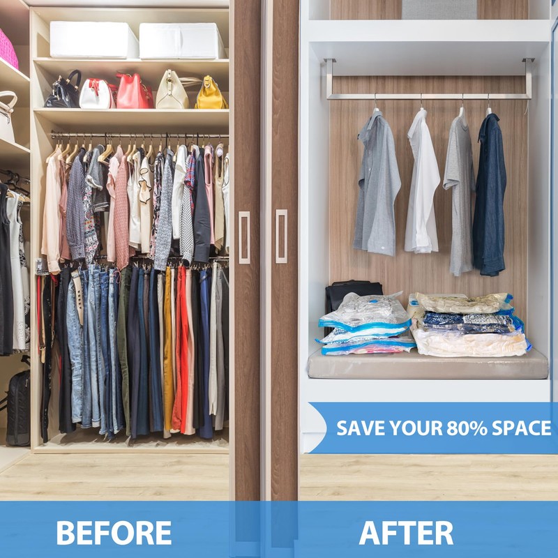 - Ultimate Space Saving: YAWAHOME vacuum bags can reduce clothing volume by 80%, easily storing bulky winter quilts, coats, and seasonal items like sweaters. Ideal for optimizing closet space in small homes, organizing moves, or packing for trips, they allow compressing more items without clutter.