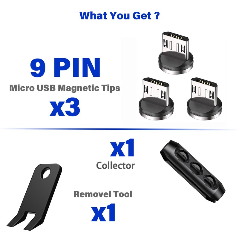 - What You Get: 3 pack magnetic micro USB tips; 1 pack organizer.