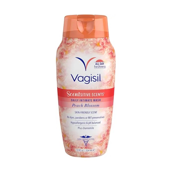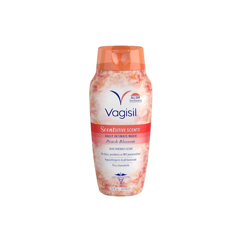 Incluye 1 botella 354ml de Vagisil Peach Blossom Scentsitive Scents lavado vaginal diario íntimo.