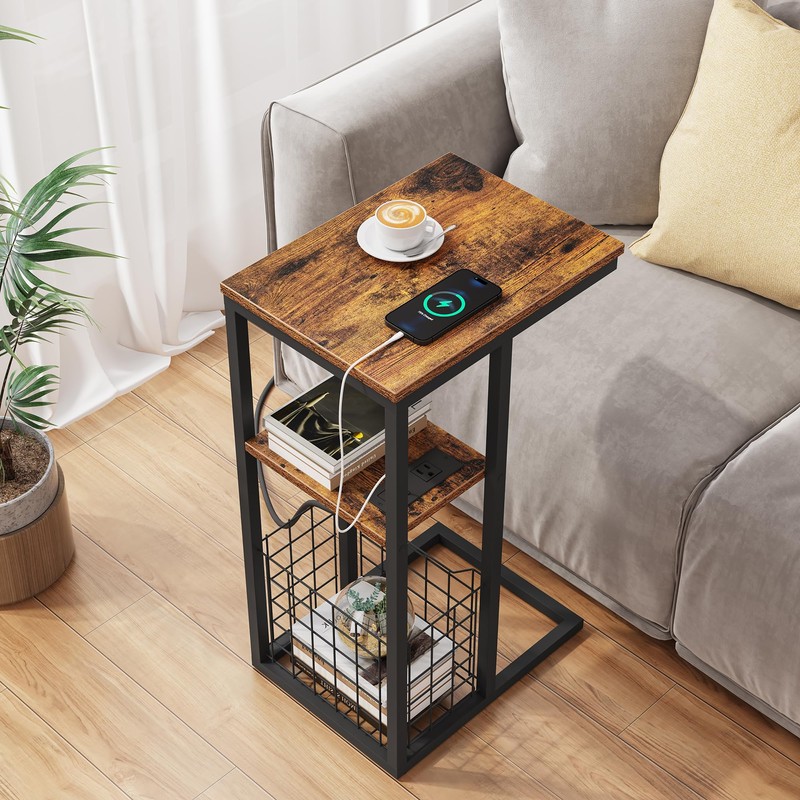 Vagusicc C Shaped End Table with Charging Station, Side Table for Couch, Small Side End Table for Small Spaces, 28" High Slide Under Sofa Table for Coffee, Tv Tray Table for Living Room, Rustic Brown