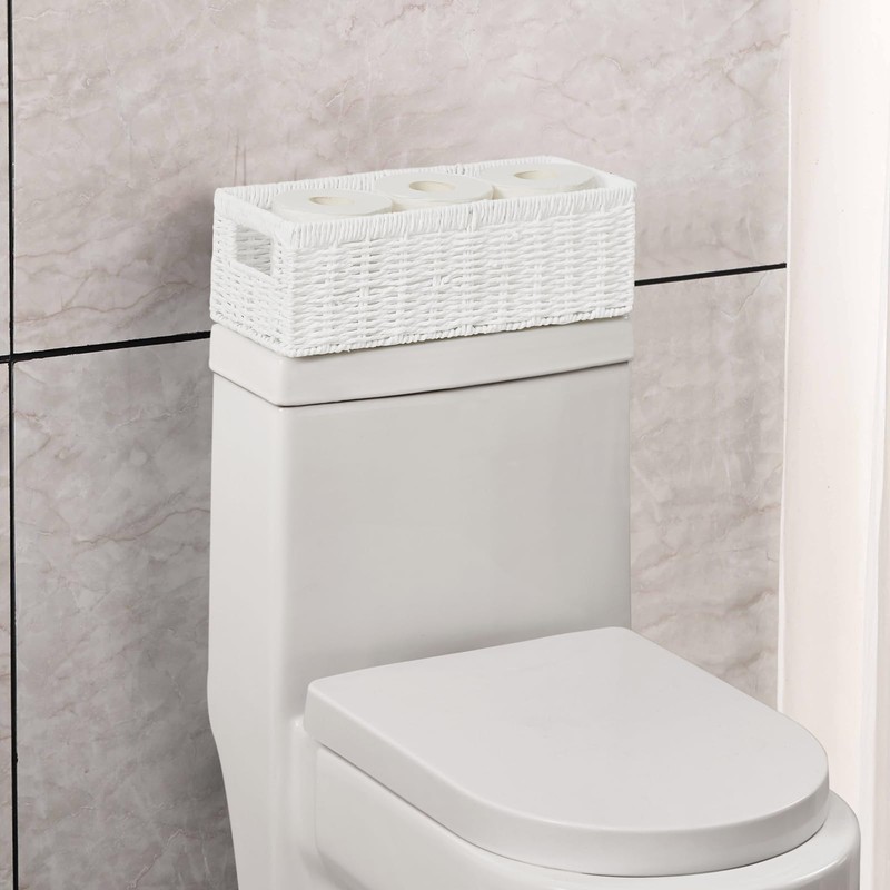 - 【PRACTICAL DESIGN & SIZE 】Baskets with built-in handles for easy access, lifting and carrying. Toilet tank basket come in a set of 2, and each dimension is 14 ¼"L x 6 ¼"W x 4 ¾"H, size may vary within 1/4 inch due to handwoven design
