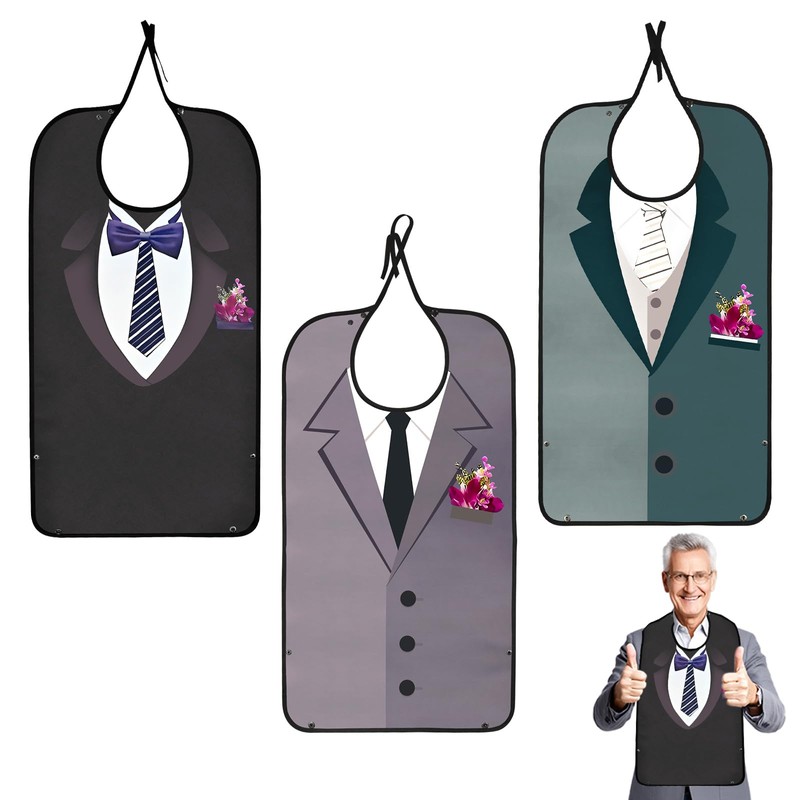 - Product details: set of 3 adult bibs in formal suit shape and print with bow tie, combines elegance with functionality. Each bib (84 x 44 cm unfolded) has two adjustable neck buttons to adjust the tightness.