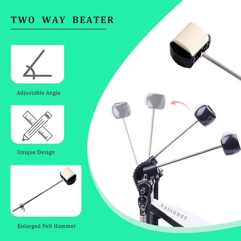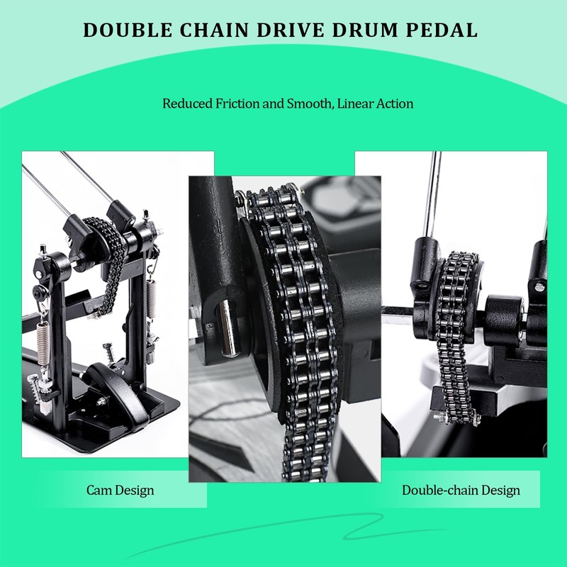 - DOUBLE CHAIN DRIVE - Compared to using single chain bass drum pedal, the Vaisoeny double bass drum pedal adopts double chain drive. Improved the stability and handling of bass drum pedal, providing more sensitive force sensing.