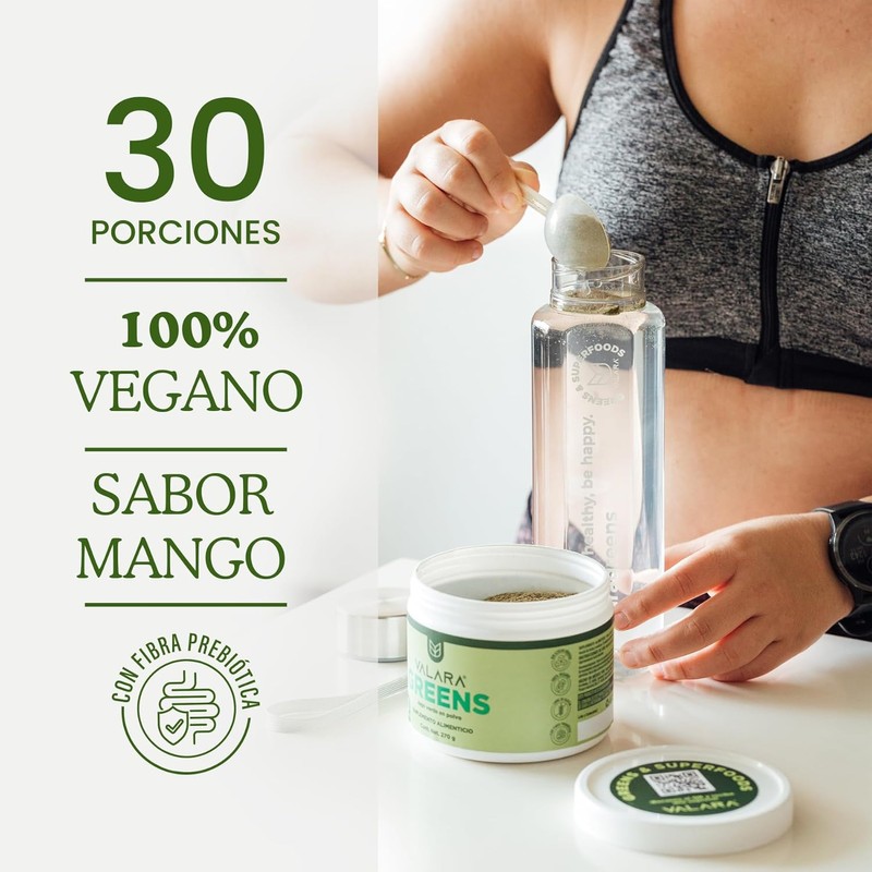 Valara Greens es un jugo verde en polvo premium que ofrece lo mejor de las frutas y verduras en una sola porción. Sin azúcar añadido, esta mezcla está diseñada para mejorar tu salud digestiva con una poderosa combinación de probióticos y prebióticos. Con 270g por envase, obtienes 30 servicios de delicioso sabor a mango que no solo apoyan tu sistema digestivo, sino también tu bienestar general. Este suplemento es ideal para aquellos que buscan un boost de energía natural y una forma fácil y deliciosa de incorporar más frutas y verduras en su dieta diaria.