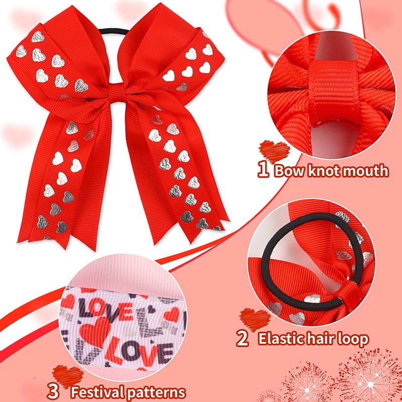 - đăValentine's Day Hair Bows TiesăPackage includes 1 x Valentine's Day red pink love heart hair bows with elastic rubber bands. These cute and stylish bows are sparkly and delicate, highlighting your hairstyle for cheerleading, Valentine's Day, New Year's Eve, Christmas, etc.