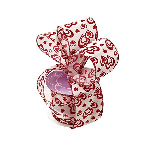 Valentine's Day Hearts Wired Ribbon – 2 1/2" x 10 Yards, Metallic Red Glitter Hearts on White Ribbon, Christmas, Wreath, Swag, Décor, Gift Wrap, Hair Bow, I Love You, Bows