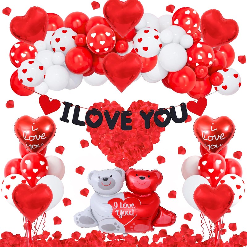 - 【77PCS ROMANTIC VALENTINES DECOR】: This set has 62pcs round balloons, 8pcs heart shaped balloons, 1pc I LOVE YOU bear balloon, 1pc banner and 1000 rose petals. Balloons can not only be scattered on the bed, on the floor or floating in the air, but they can also be combined with our arch strip and hung in a suitable place. With such variety and quantity, you can decorate any romantic space how you want.