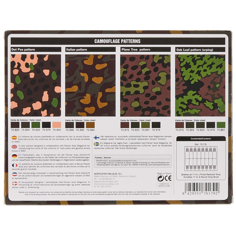 16 different highly acrylic colors, each in 17ml plastic 'eye dropper' bottles and (1) Toray brush #000: German Black Brown (70822), Luftwaffe Camo Green (70823), German Pale Brown (70825), German Camo Med Brown (70826), Tan Earth (70874), Beige Brown (70875), Middlestone (70882), Brown Violet (70887), Intermediate Green (70891), Camo Olive Green (70894), Extra Dark Green (70896), Uniform Green (70922), Flat Flesh (70955), Camo Dark Green (70979), Flat Earth (70983) and Hull Red (70985).