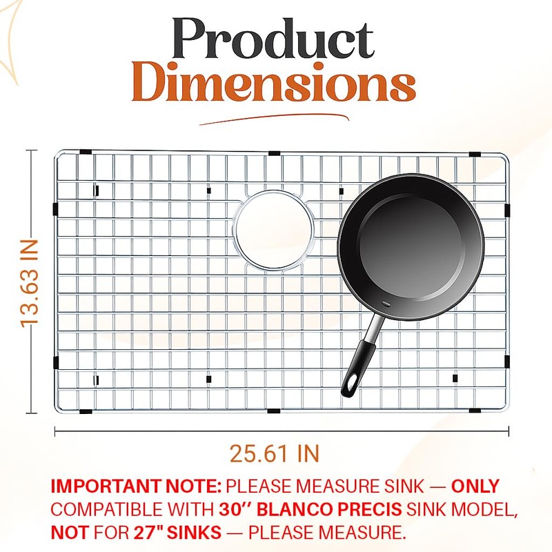 • PLEASE MEASURE SINK BEFORE PURCHASING: 236593 ONLY COMPATIBLE WITH 30" Blanco Precis, the sink grid size is 25.7" x 13.7", this 25.7" x 13.7" is not the sink size.