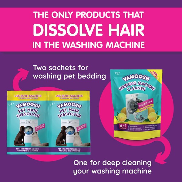 Vamoosh Vamoosh Pet Hair Dissolver (2x 100g Sachet) & Vamoosh 6-in-1 Washing Machine Cleaner (1x 150g Sachet) Bundle, Removes Hair, Cleans Pet Bed & Machine, 3 Washes