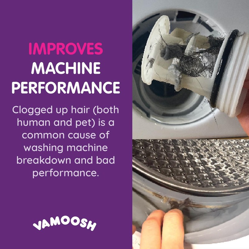 - PROTECTS YOUR MACHINE - Vamoosh dog and cat hair remover keeps future washes hair-free and your machine's vital parts clean, extending its life. Plus, regular use of Vamoosh's dissolving hair removal formula helps safeguard your family from germs