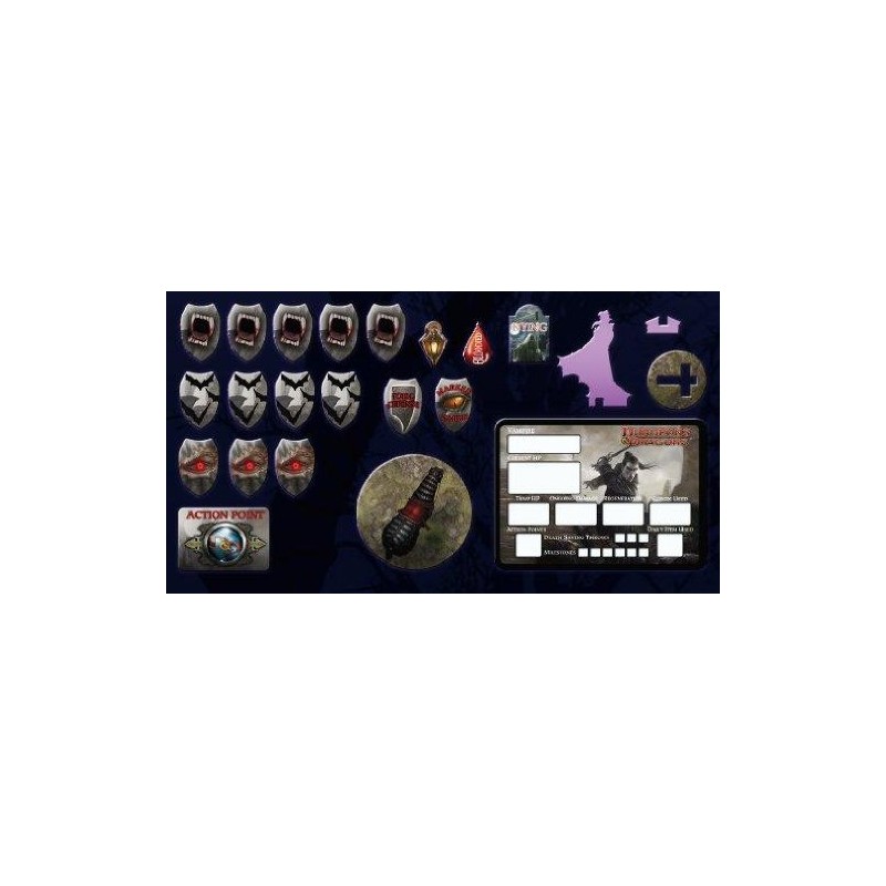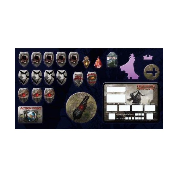 The Action Point Tile is a handy reminder for players to make an extraordinary move to turn the tide of combat. The Light Source token can be slipped onto the base of your model when your character is scouts ahead of party with a torch or lantern. The Bloodied token conveniently marks your model when the never-ending battle begins to take its toll, while the Dying token reminds the group that you may have disarmed your last trap.
