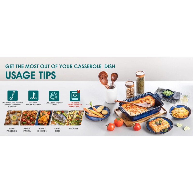 【MICROWAVE & OVEN & DISHWASHER SAFE】This casserole dish is safe in the microwave, oven, and dishwasher, offering convenience and ease of use for busy households. The glossy finish makes it easier than other materials to clean. Hand washing or dishwasher is suitable for bakeware pans, the glossy casseroles still keep brand-new after a long time of use. NOTE: No direct fire and induction cooker.