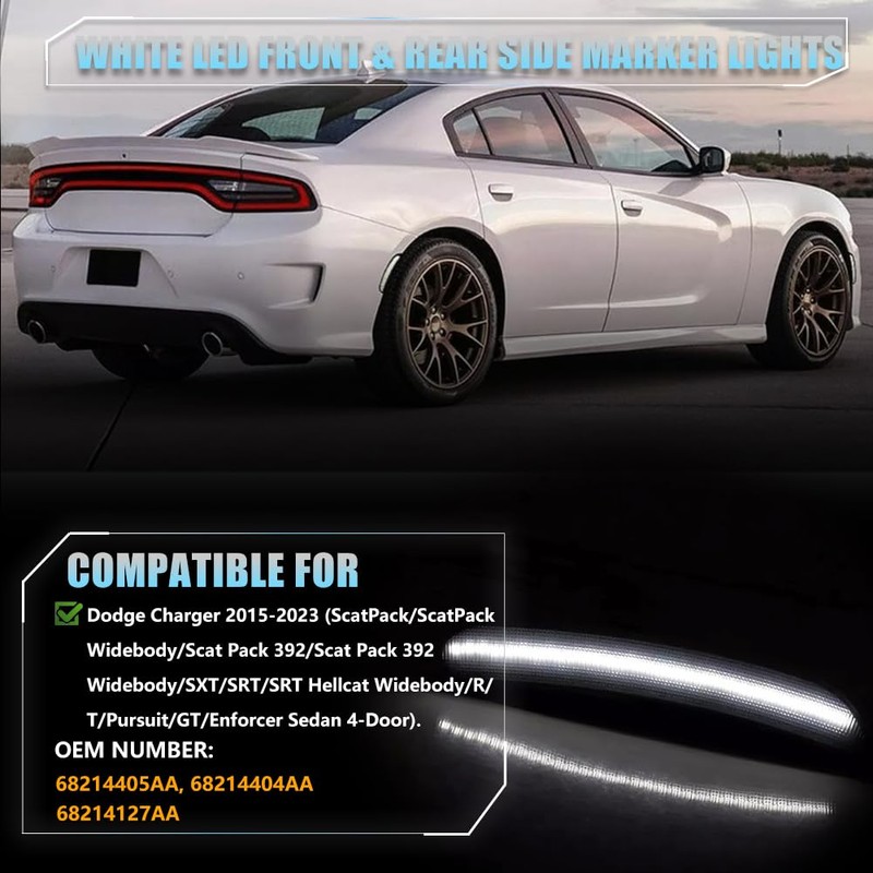 [Compatibility] ONLY fit for Dodge Charger 2015 2016 2017 2018 2019 2020 2021 2022 2023 (ScatPack/ScatPack Widebody/Scat Pack 392/Scat Pack 392 Widebody/SXT/SRT/SRT Hellcat Widebody/R/T/Pursuit/GT/Enforcer Sedan 4-Door). These lights perfectly replace the OEM parts: # 68214404AA/CH2551133(Right Front), 68214405AA/CH2550133(Left Front), 68214126AA/CH2861110(Right Rear), 68214127AA/CH2860110(Left Rear). Please check your car model before ordering.