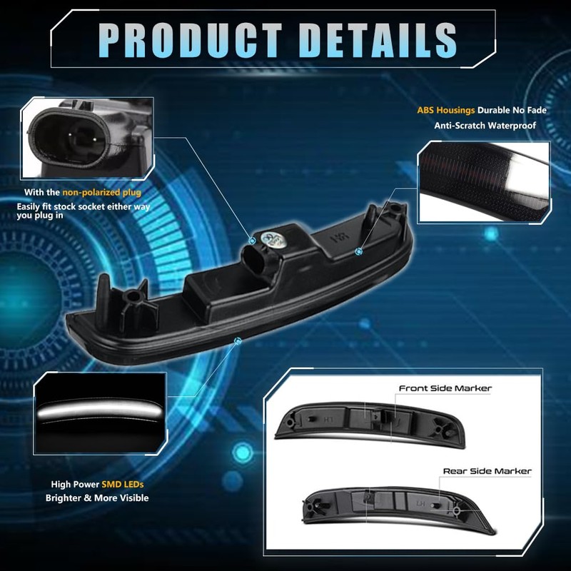 [Premium Quality & Long-lasting Performance] Crafted with a modern PC lens, these side marker lights offer improved illumination and a sleek look. Made from durable ABS housing, they are sealed, waterproof (IP67), and resistant to heat and fading for long-lasting performance.