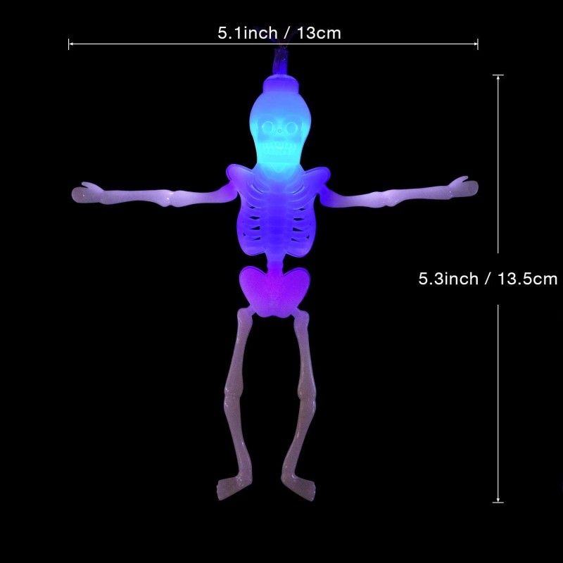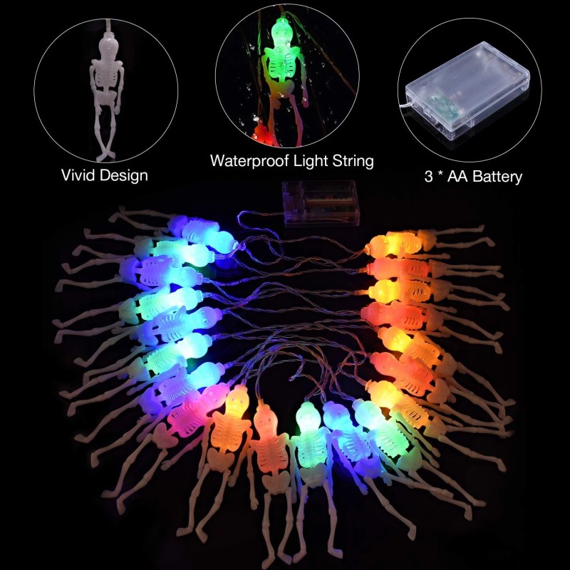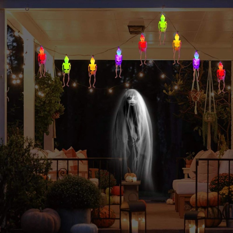 - Multi-color 20 LEDs Ghost Lights - 20 LEDs string lights glow in 4 colors (blue, green, red, orange ), which makes the Halloween theme fun and spooky. Each skeleton is about 5.5 inch tall, and it stands out just the way it should when you switch on the light.