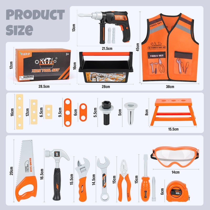 - [43-Piece Kids Tool Set] Includes all essentials for pretend play: a portable toolbox, vest, and electric drill (2xAA batteries not included) with 3 bits and more. Pretend play tools toys for 3 4 5 6 years old boys girls.