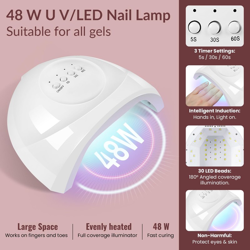 - 48W U V Nail Lamp: The U V nail lamp with 30 LED beads, can quickly cure all kinds of gel nail polish, base and top coat, poly nail gel. There are 3 timer settings (5s, 30s, 60s ) and auto-sensing function: hands in, light on; hands out, light off. This U V nail lamp is non-harmful to nails and non-blacken to skin.