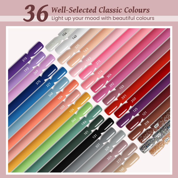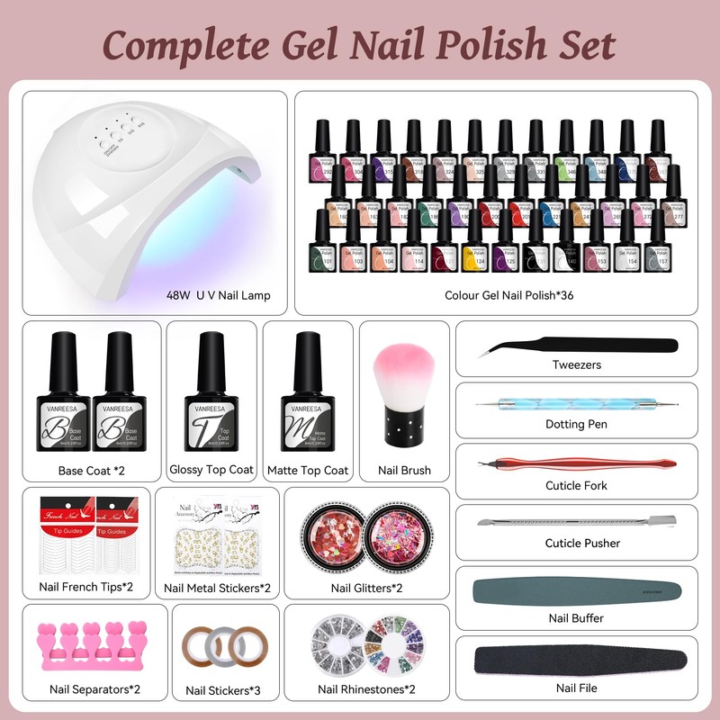 - VANREESA Gel Nail Polish Set: This gel nail kit includes 36*8ml gel polish, 2*8ml base coat, 2*8ml glossy and matte top coat, 48W U V nail lamp, basic nail art tools and decorations. 36 beautiful shades of popular and trendy colours, suitable for spring, summer, autumn, winter and everyday life! Create gorgeous, glittering nail designs with these colourful gel nail polish.