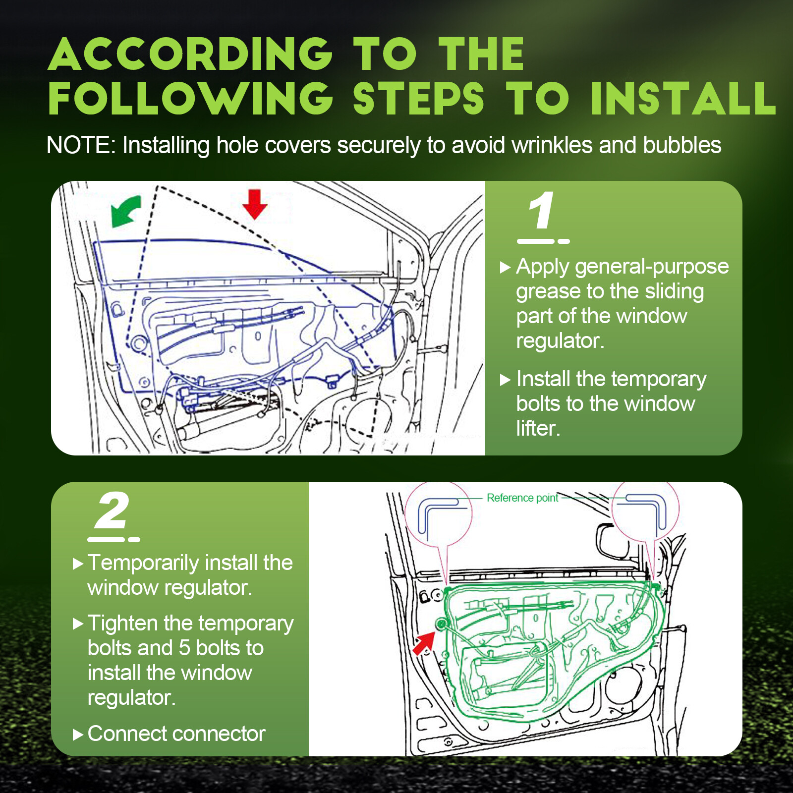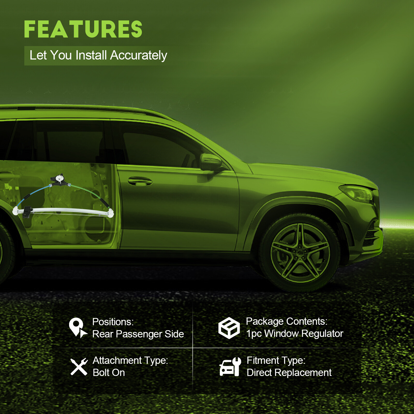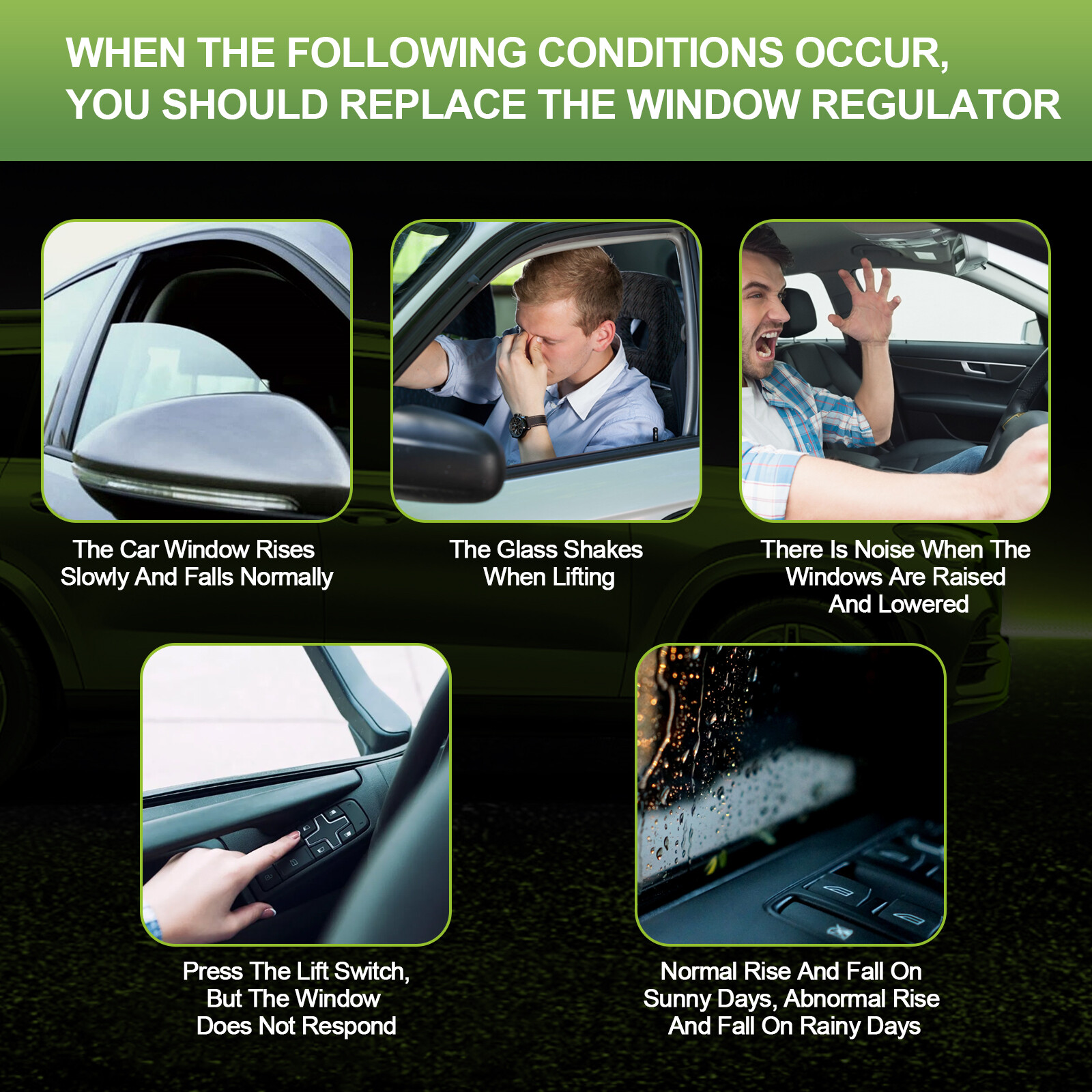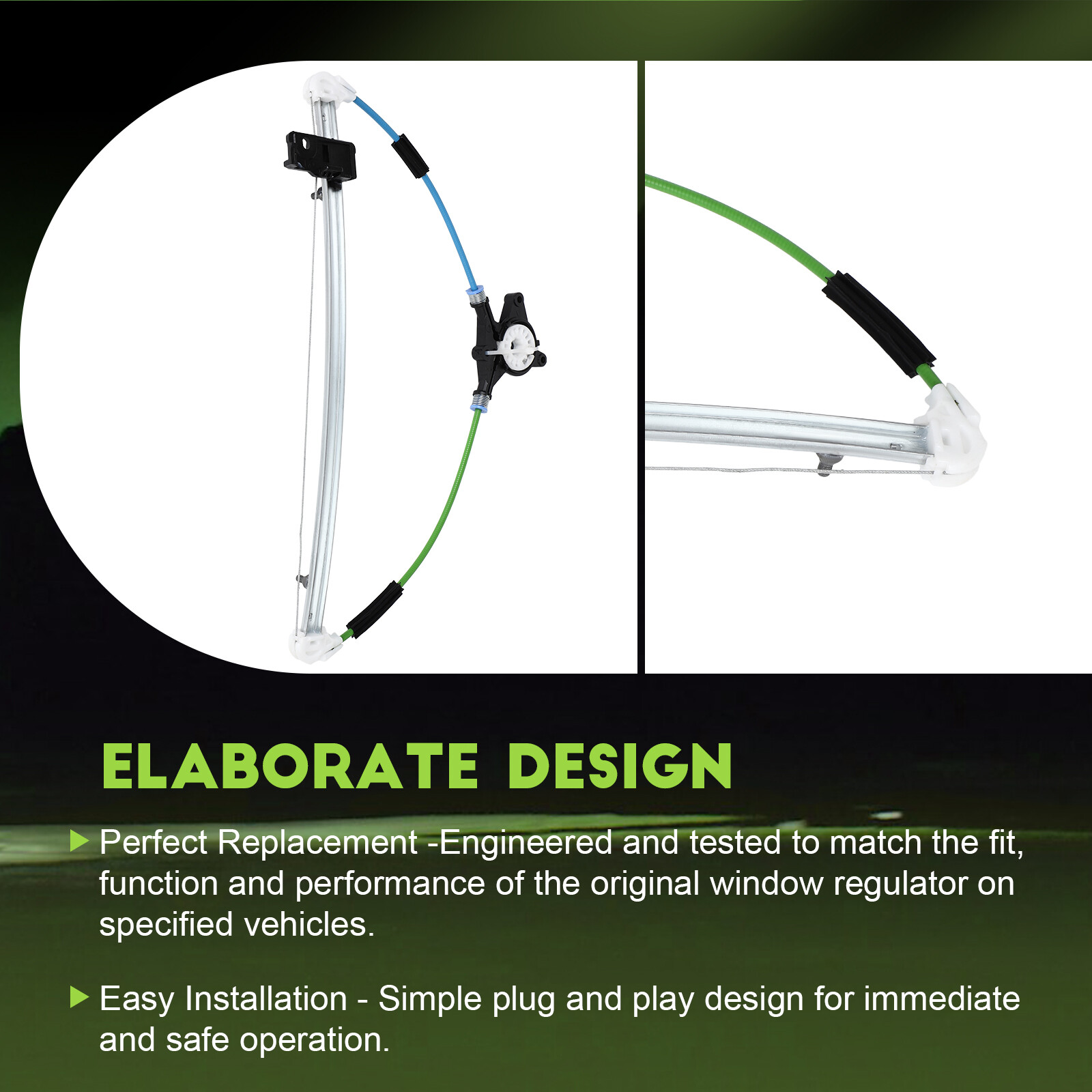 Our window regulator offer value without compromising quality. It with premium material and solid construction, ensures high strength and reliability. They direct fit -No missing holes, hardware or mounting brackets. It has been 100% tested for RPM, rotational direction, amperage and torque before shipment.