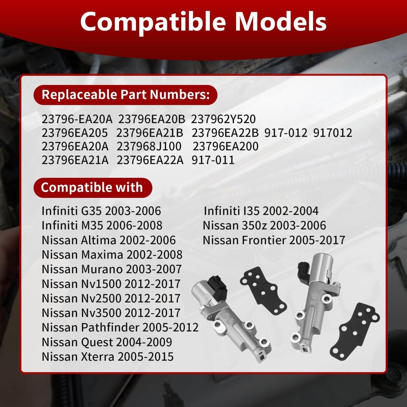 - FITMENT: VVT Solenoid Replacement for Nissan 350Z 2003-2006 / Altima 2002-2007/Maxima 2002-2008/Murano 2003-2007, compatible qith Pathfinder 2005-2010 / Quest 2004-2009/ Xterra 2005-2010. The variable valve timing solenoid valve kit fit for Infiniti FX35 2003-2009/G35 2003-2007/I35 2002-2004/M35 2006-2008