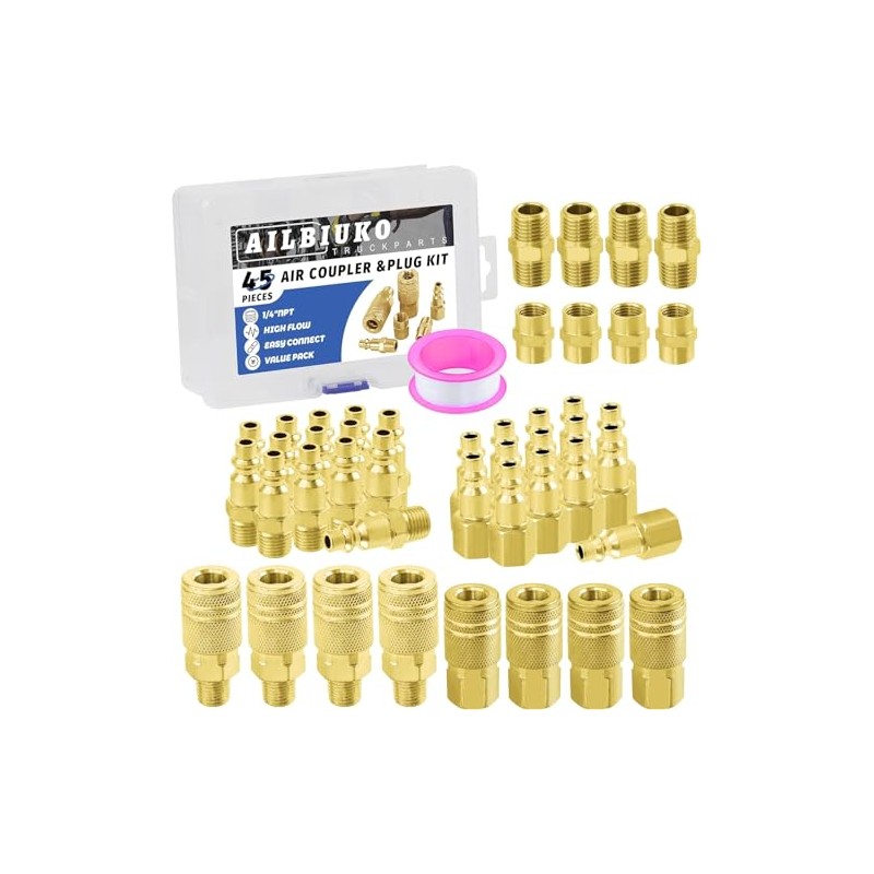 Value Pack: A 45-piece 1/4" quick connect air fitting kit, including 4 female air couplers, 4 male air couplers, 14 male air plugs, 14 female air plugs, 4 hex couplers, 4 hex nipples, and 1 roll of teflon tape, which can largely meet your basic needs Premium Material: Our air hose fittings are made of iron (except for the hex coupler and nipple, which are made of brass). There is a layer of copper plating outside the fittings to improve corrosion resistance and extend the service life, ensuring excellent durability and reliability even in heavy-duty applications. Standard Design: Industrial grade M/D type. The air fitting is designed with four large locking balls for fixing and locking the plug to ensure a reliable connection. The maximum pressure of the air fitting and plug is 300psi, and the basic body size is 1/4 inch. Quick Connection: Easy to install and quickly disconnect. It is interchangeable and compatible with most manufacturers' coupler plugs, preventing air leaks and avoiding costly replacements. Wide Application: Our 1/4" air couplers and air plugs kit are widely used in professional job sites, automotive shops, auto dealership service departments, homes, and garages for air hoses, air compressors, air tools, air nailers, air blow guns, pressure washers, etc.