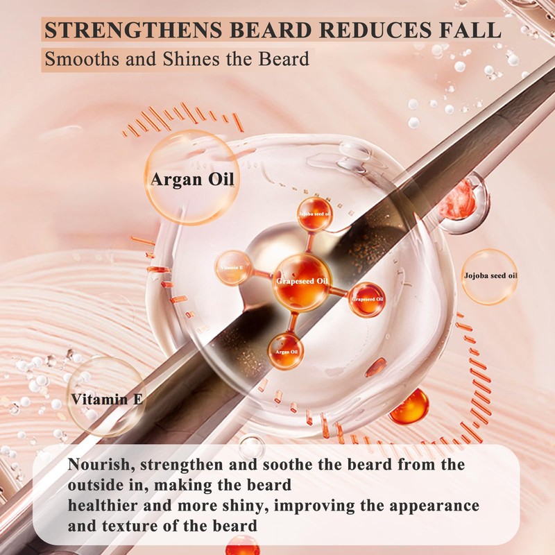 - Our beard oil features a unique blend of pure natural ingredients, including Moroccan Argan Oil, Grapeseed Oil, Vitamin E, and Jojoba Oil. These components work together to moisturize and nourish without leaving any greasy residue. They provide antioxidant benefits and help balance the natural oils in your beard. Free from fragrance, parabens, phthalates, sulfates, and other harsh chemicals, our beard oil is safe and gentle on your skin.