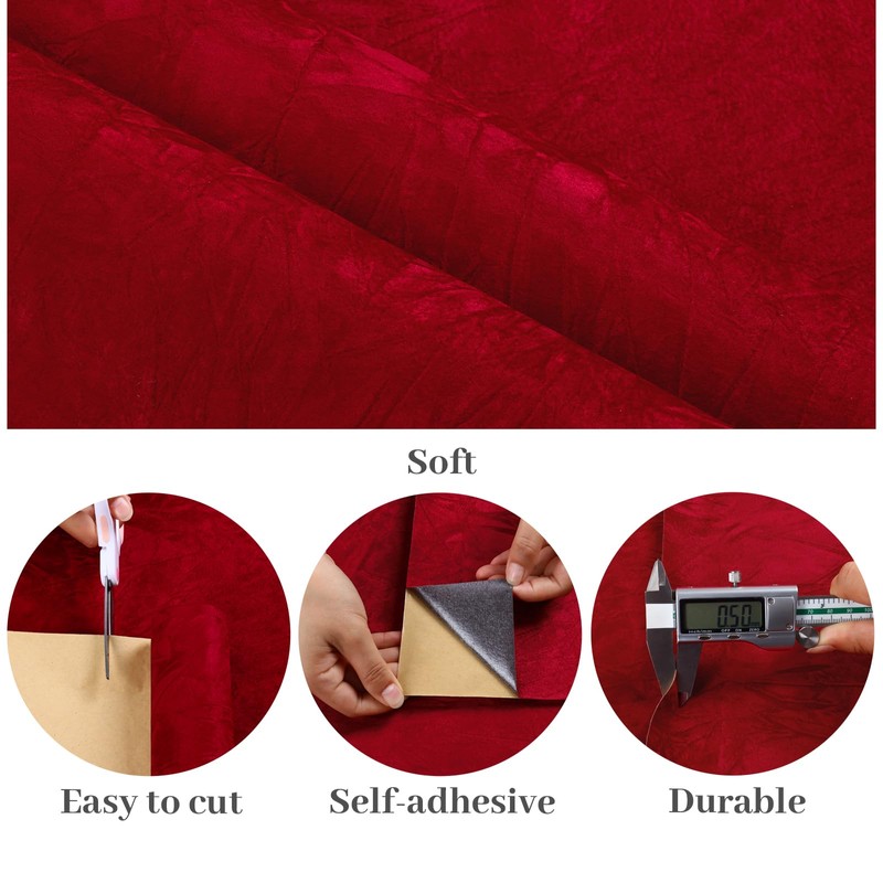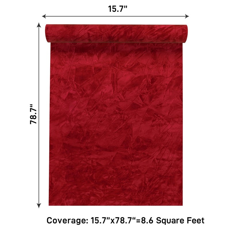 - Size & Material: 15.7 inches wide by 78.7 inches long, covers 8.6 square feet each roll. Thickness is 0.5mm. Red velvet wallpaper, crushed velvet fabric design, vintage and elegant appearance. Made of high quality velvet fabric, thick, durable, flocked finish, soft touch, anti-scratch, tear-resistant, waterproof, non-fading for long time