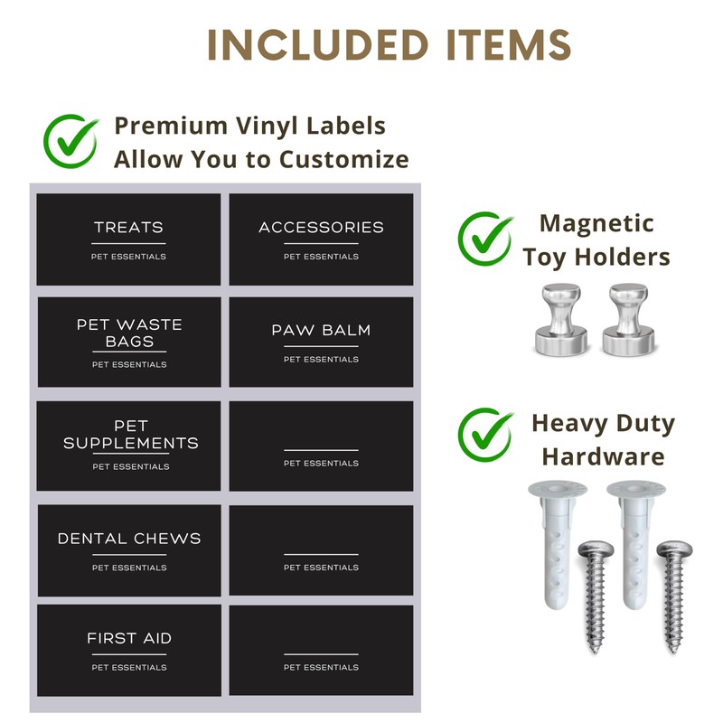 - What’s In The Securely Packaged, Recyclable Box: One Metal dog leash holder for wall pet storage organizer with Three airtight 16 oz dog food containers, Two Magnetic Dog dog toy storage holders, plus Ten Customizable Pet Essentials Labels, Install Hardware with detailed easy-to-follow, written, English Install Instructions; Images may include additional items or props for display purposes, which are not included in the purchase of this product