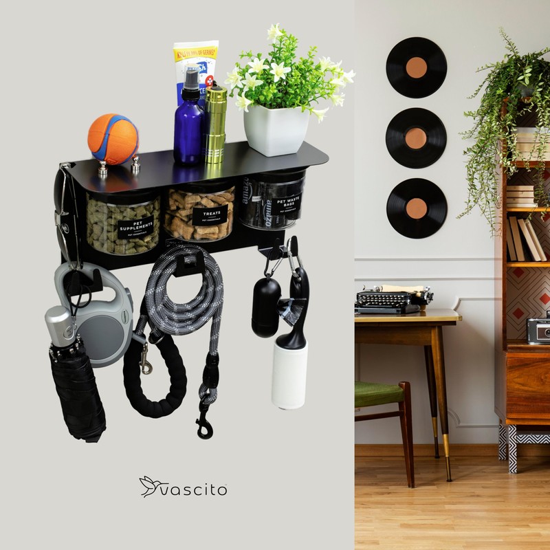 Vascito Pet Station Shelf Storage Organizer Dog Leash Holder for Wall, Dog Storage Organizer with 13.5" Dog Shelf, Dog Hooks and 3 Airtight 16oz Dog Treat Jars, New Puppy Essentials