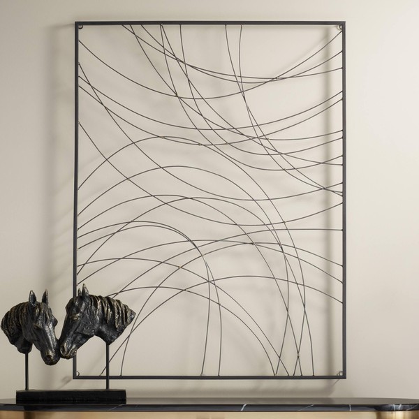 From Dahlia Studios, this contemporary metal wall art is a sculptural piece that enlivens over a mantel or tabletop. It features a rectangular frame with a hand-painted black finish and curved wires within to create its artistic effect. Installs easily with ring hook hangers on the back.