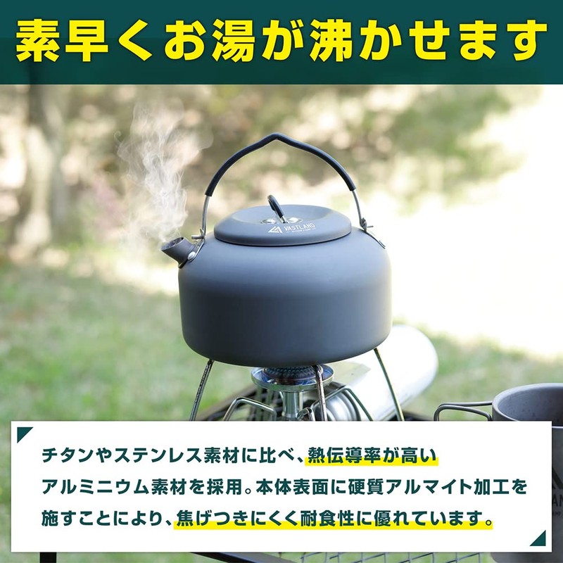- The camping kettle allows you to quickly boil hot water. Uses an aluminum material with a higher thermal conductivity compared to titanium and stainless steel. Hard anodized surface for superior corrosion resistance