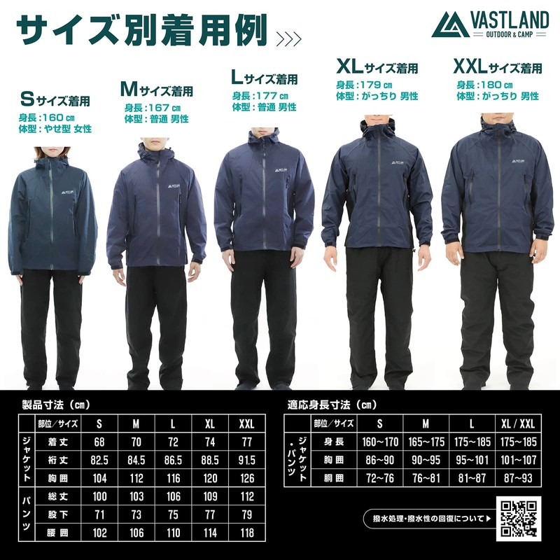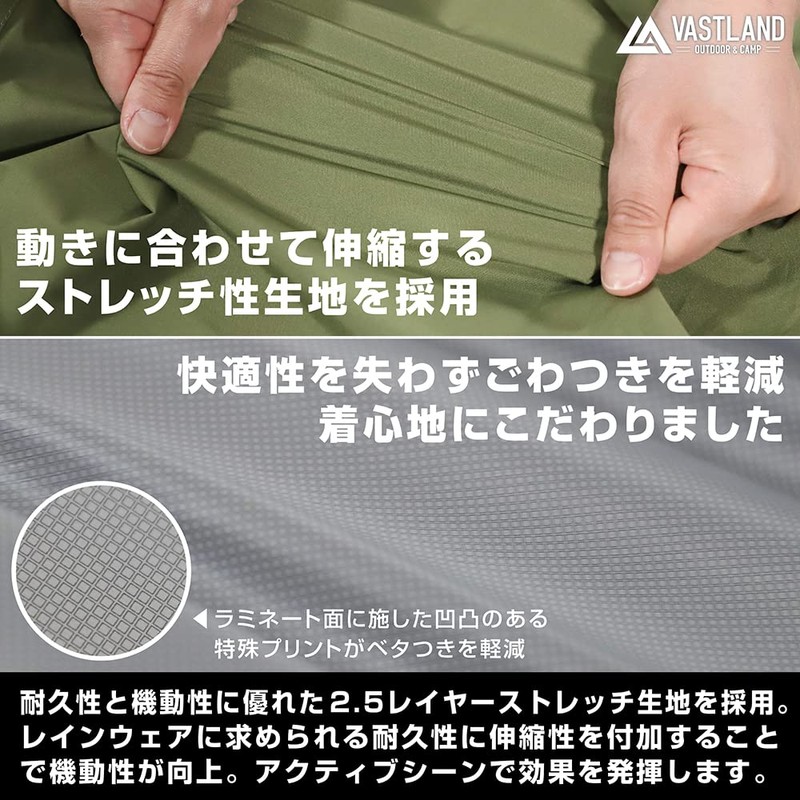 - Uses water repellant, waterproof and breathable fabric that was originally developed by VASTLAND and garment factories.In addition, the back of the sewed part uses seam tape processing to prevent water from entering in through the seams.