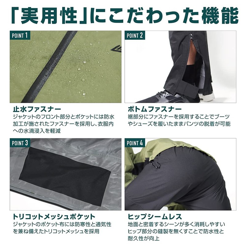 - Uses 2.5 layers of stretch fabric with excellent durability and mobility.Increased mobility by adding stretch to the durability required for rain wear.Effective for active situations such as when working.