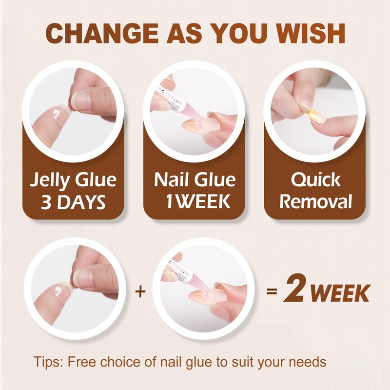 - KEEP 2 WEEKS AND REUSABLE: Long-Lasting for 2 Weeks with Nail Glue and Jelly Glue together, You can also use Jelly Glue or Nail Glue alone for 3-7 days, Ideal for short and long term events, and change anywhere and anytime