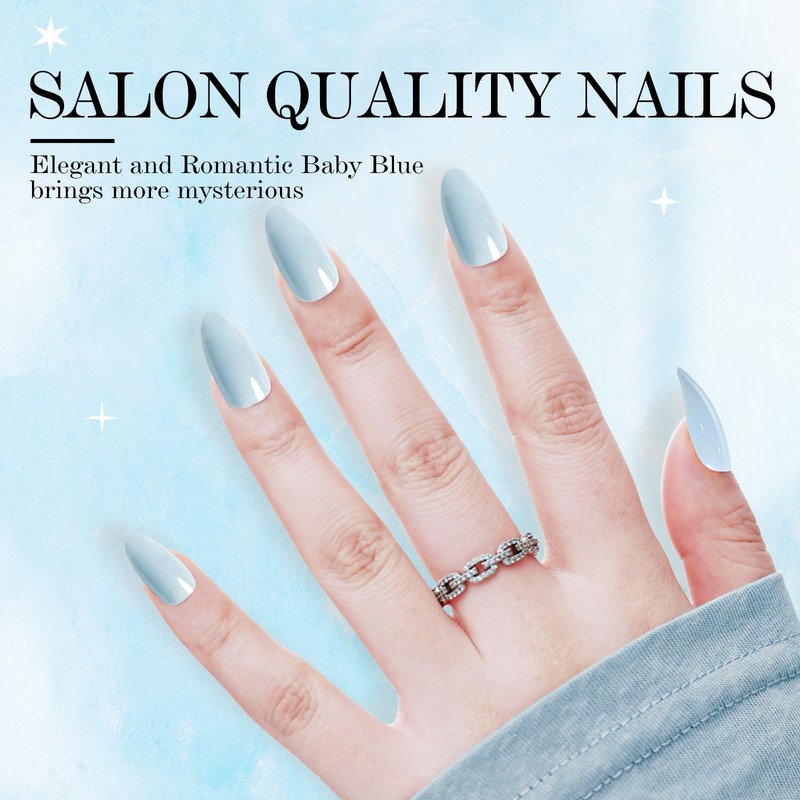 - 24 NAILS IN 12 SIZES: Elegant and Romantic Baby Blue Almond Nails brings more mysterious, set with Nano glass file, jelly gels and pink glue, with 12 different sizes for various nail sizes ensure a totally custom fit