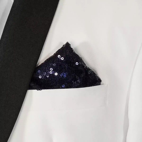 Dress up your suit, tux, blazer or sportcoat with a pre-folded sequin pocket square. It's easy to use and looks like a well placed pocket square. Just slip the insert into your breast pocket and cut or fold cardboard to adjust to the height size you want.
