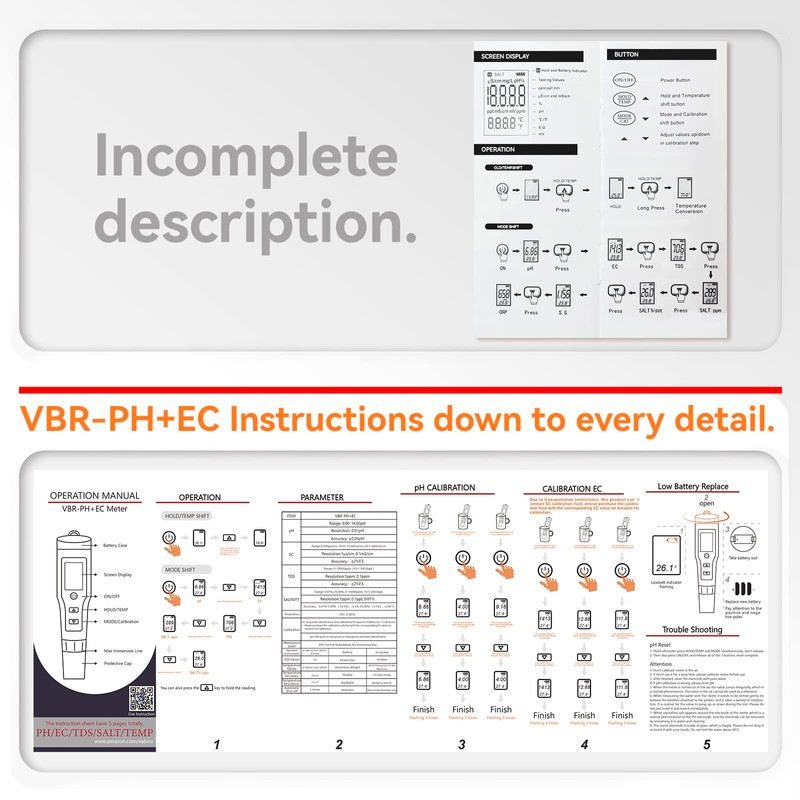 - The instruction sheet of the VBR-PH+EC meter is very detailed.
