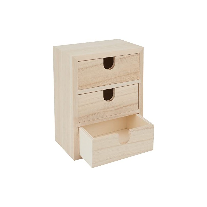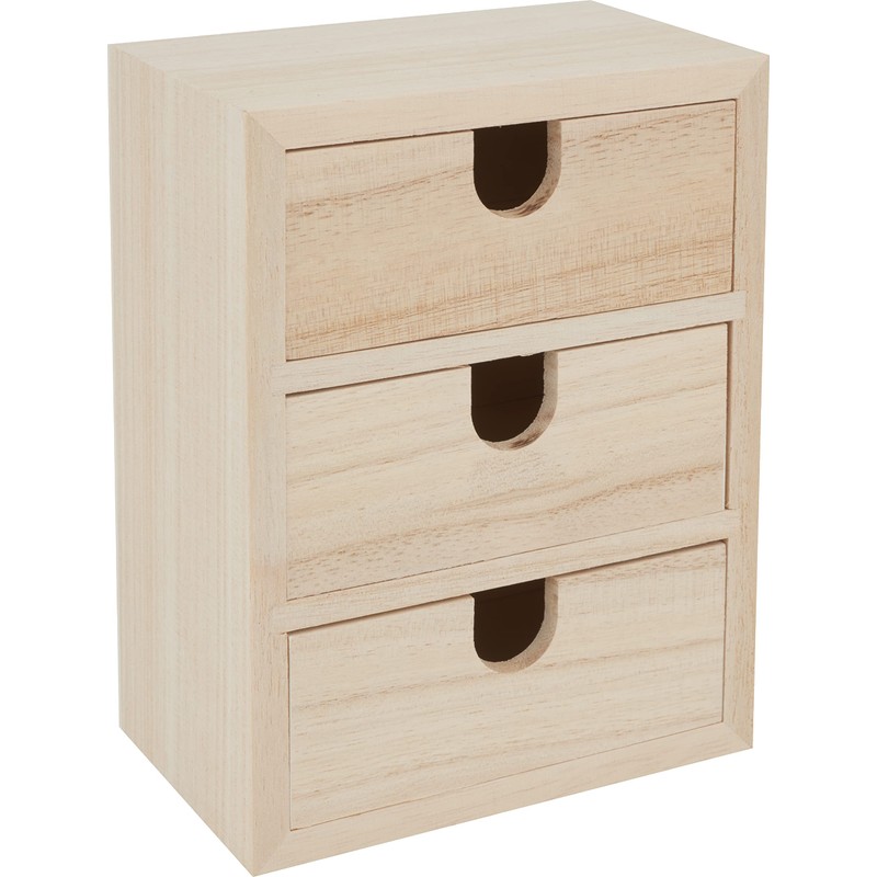 Beautiful VBS mini cabinet with 3 drawers made of raw wood. The cabinet has a size of approx. H 14.5 x W 11.5 x D 7 cm. One drawer measures approx. H 3.3 x W 8.8 x D 5.8 cm. The mini cabinet can be decorated with craft paint or even napkin technique. A great little organiser.