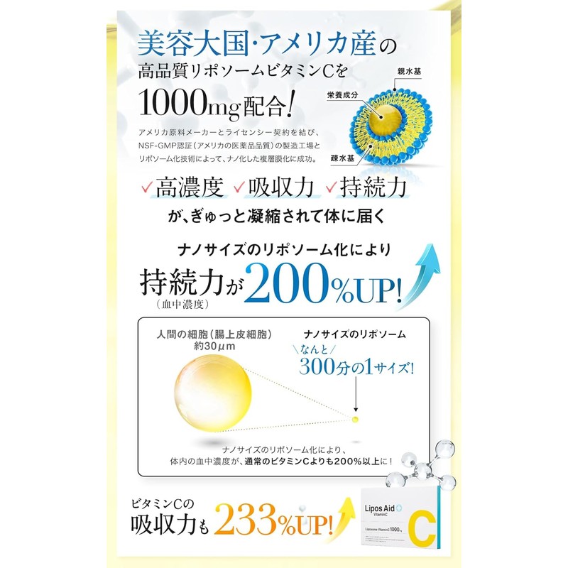 美容大国アメリカ産の高品質ビタミンCを使用し、NSF-GMP認証工場でナノ化・複層膜化を実現。吸収力・持続力を最大限に高めたビタミンCサプリメント。