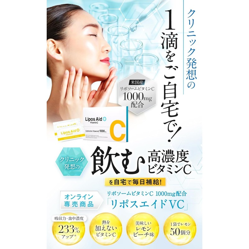 ✨ヘルスアドバイザーが使用したいリポソームビタミンC No.1獲得*:自宅で毎日補給できる米国産リポソームビタミンC1000mg配合の飲む高濃度ビタミンC。吸収しやすいリポソーム化されたビタミンCで、手軽に美味しく飲めて続けやすい。有名女性誌にも掲載されたクリニック発想の一滴をご自宅で体験ください。*実施委託先:日本コンシューマーリサーチ 調査期間:2022年4月19日~4月22日 調査方法:インターネット調査 調査概要:リポソームビタミンCを扱う10社を対象としたブランド名イメージ調査 調査対象:ヘルスアドバイザー326名 順位評価基準:回答数比較