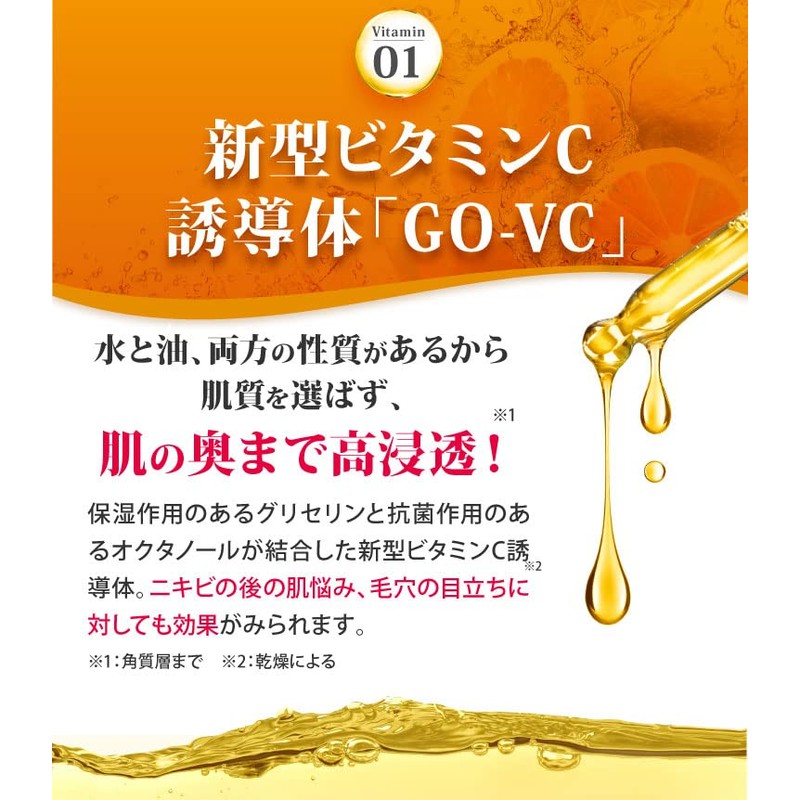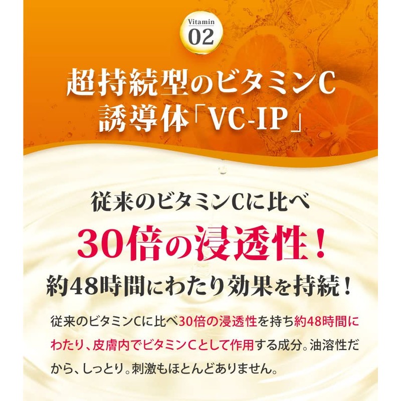 Acne and Acne Scars for effective new derivative of vitamin C on the go – VC and duration of a vitamin C derivative VCIP to the blend. Even your skin henna will give you the naiasinamido of water-soluble vitamin B3 from a luxurious vitamin serum. The new vitamin C derivative of the Go – VC, can expect a high improvement effect and antibacterial effect against redness, acne, acne and acne scars and thorough approach. Pores Effectively and 小ziwa alike. Duration of a vitamin C derivative VCIP has, compared to regular vitamin C. penetrates twice the power to hold, interacts and more for a long time in the skin as well. Control sebum secretion ability to care for acne and grease proof to firm skin on the inside.