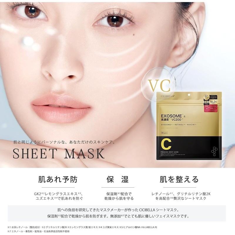 [liber]パック 顔 大容量 日本製 フェイスパック レチノール 高濃度 vc200 ヒト幹細胞 エクソソーム シートパック 乾燥肌 敏感肌 保湿パック ビタミンc 30枚 低刺激 日焼け クセ 毛穴のひらき ハリ肌 ツヤ肌【適格請求書発行事業者】cicibella EXOSOME (3個セット, VC200×ヒト幹細胞)