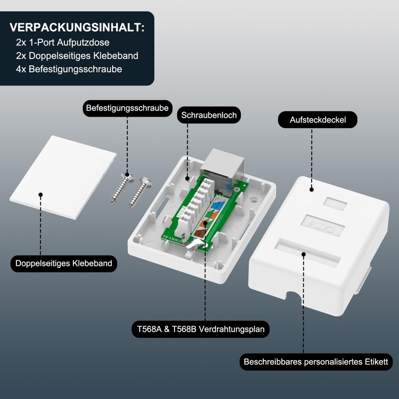 - EASY TO USE: If installation of in-wall sockets and cables is not possible, the Cat6 Ethernet surface mount boxes are the solution. You can use the included mounting screws or the double adhesive tape to attach the can to the wall, skirting board, ceiling and other places