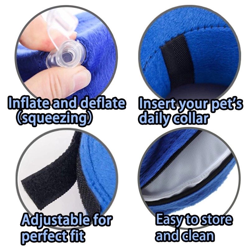 Inflatable recovery collar, you can deflate it and store it in a small space when you do not use it and there is a zipper opening on one side, you can take the bag out and wash the outside cloth washable.