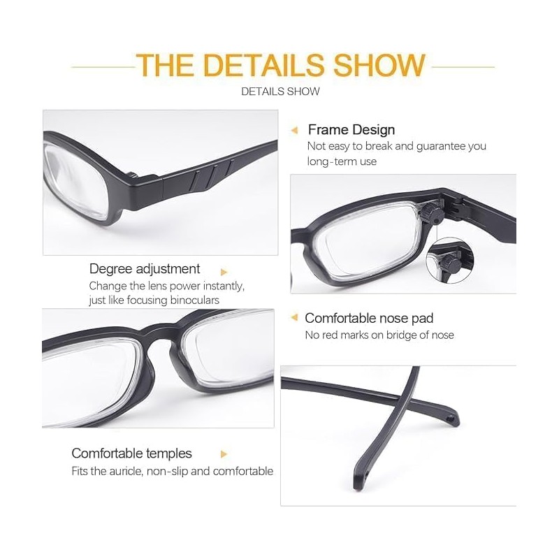 - ♚【STURDY, FLEXIBLE AND LIGHTWEIGHT】Carrying two or more pairs of glasses must be a hassle when you're out and about. Our adjustable glasses do have a plastic frame but the material has been treated to withstand any bumps or bends the glasses might sustain in your pocket or suitcase.The lenses are durable enough to withstand accidental drops and force. You do not have to worry about breaking them.Employed with flexible structure that fits heads of all sizes, it is perfect for both men and women.
