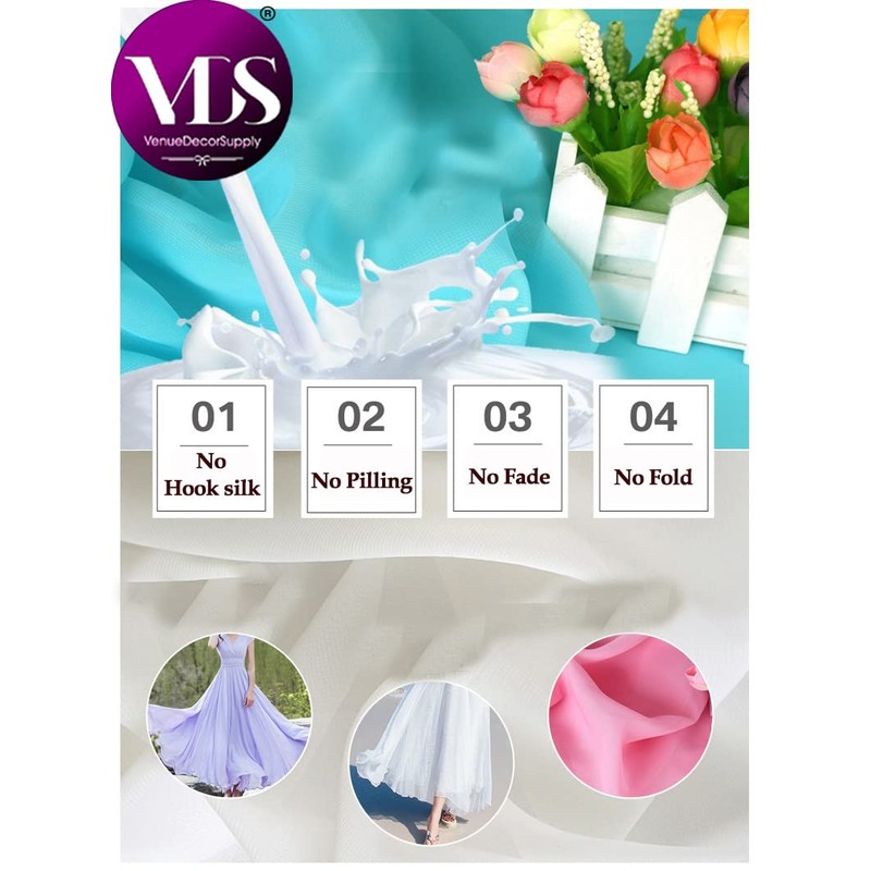 - 🎦 VERSATILE APPLICATION: This multi-purpose chiffon fabric has the characteristics of lightweight and breathable, which is perfect for creating stunning clothing items such as wedding dresses, wedding gowns, evening gowns, sheer blouse, belly dance skirt, top, veil, beachwear, swimsuit beach cover up, scarves etc. Just draw your imagination to DIY what you want.