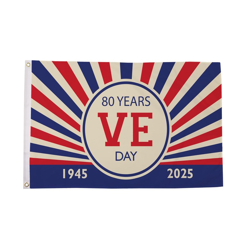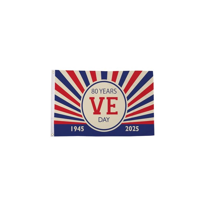 VE Day 2025 Woven Polyester Flag with Eyelets, 3 Sizes Available: 3ft x 2ft, 5ft x 3ft, 8ft x 5ft (5 ft x 3 ft (150 cm x 90 cm))