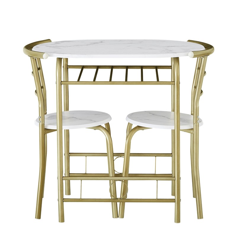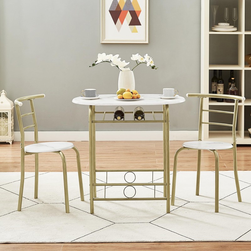VECELO 3-Piece Dining Table Set for Kitchen Breakfast Nook, Wood Grain Oval Tabletop and Metal Frame with Built-in Wine Rack, for Small Spaces, 31.5", White & Gold