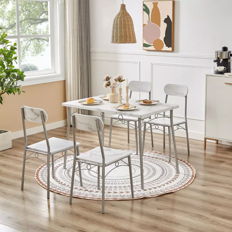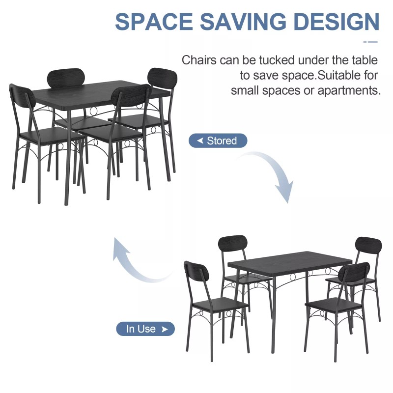 🍞【Sturdy and Durable】The 5-piece dining table set is made of MDF board and sturdy metal legs, which add extra stability. The metal frame is made of black powder-coated metal with a wood-grained finish for a sleek look. The dining table set is durable enough to withstand years of use, is versatile and easy to clean.